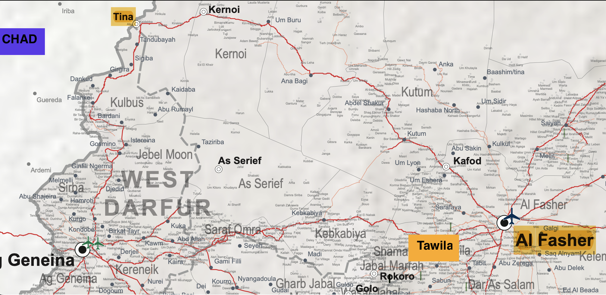 • Those from North Darfur reaching the Chad/Darfur border will have made an exceedingly arduous journey (530 km by road), filled with danger and an almost total lack of humanitarian resources (see map below). The first point of safety offering significant humanitarian resources will be #Tina (Darfur)/Tiné (Chad), a cross-border town of major significance.