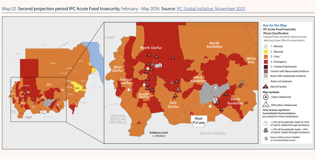 Source: IPC–Projection acute food insecurity in Sudan from February to May 2026.